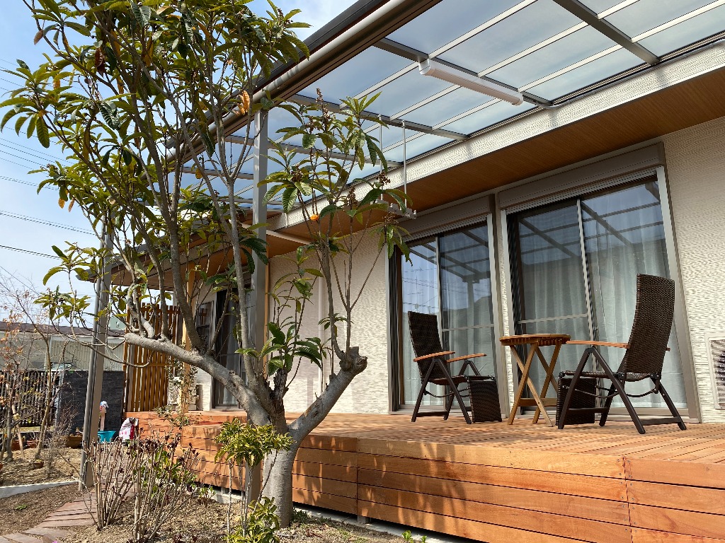 テラス屋根の下に広々としたデッキでセカンドリビングとしてゆっくり過ごす贅沢な時間。