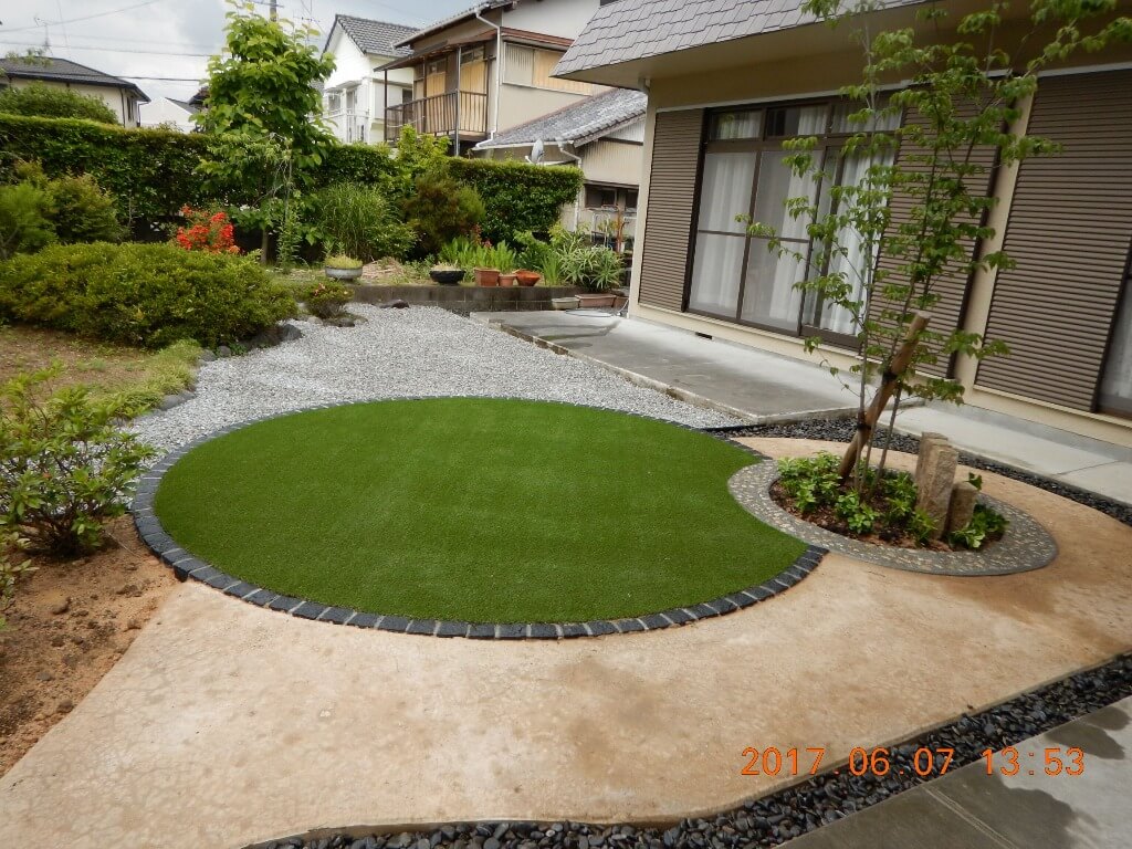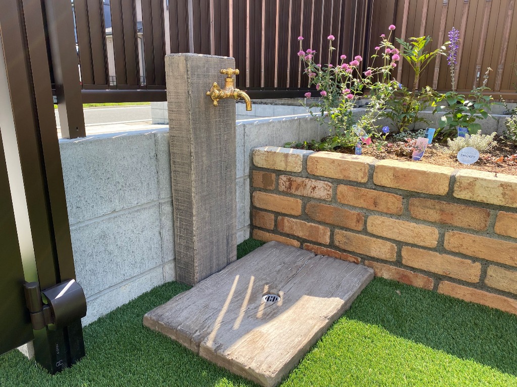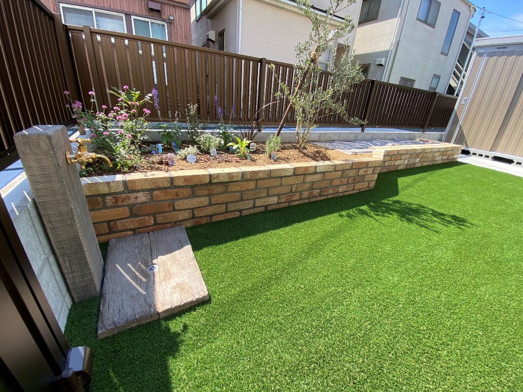 古レンガ花壇に人工芝で明るい印象のお庭。