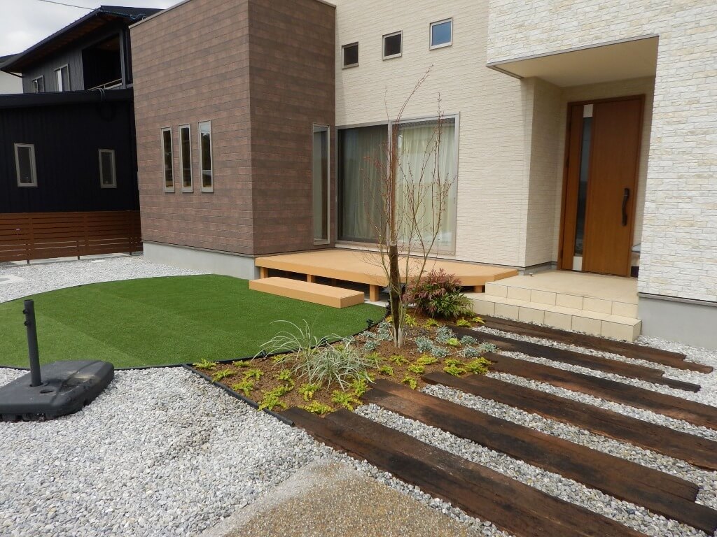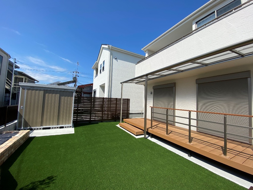 ウッドデッキと人工芝 レンガ花壇のあるエクステリア静岡県西部