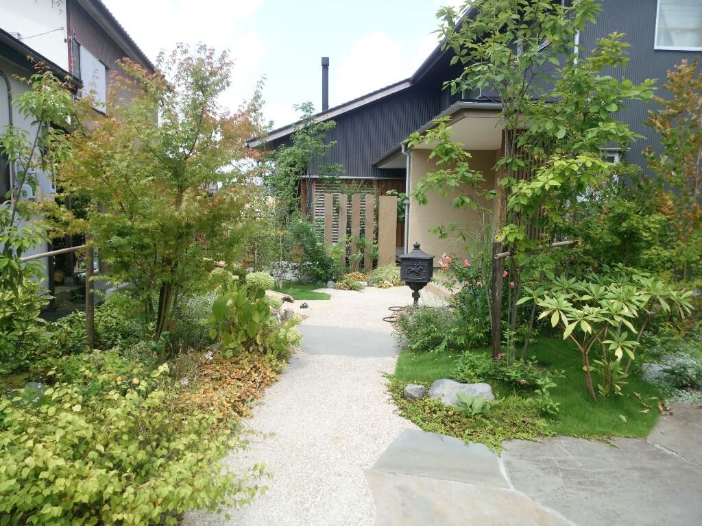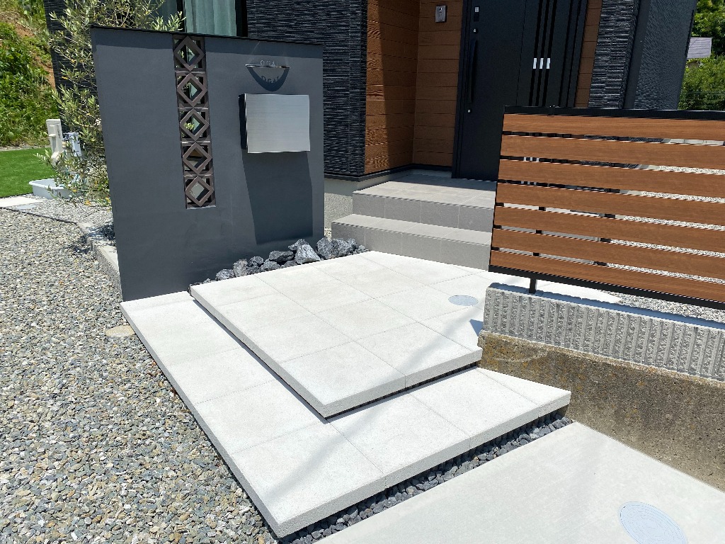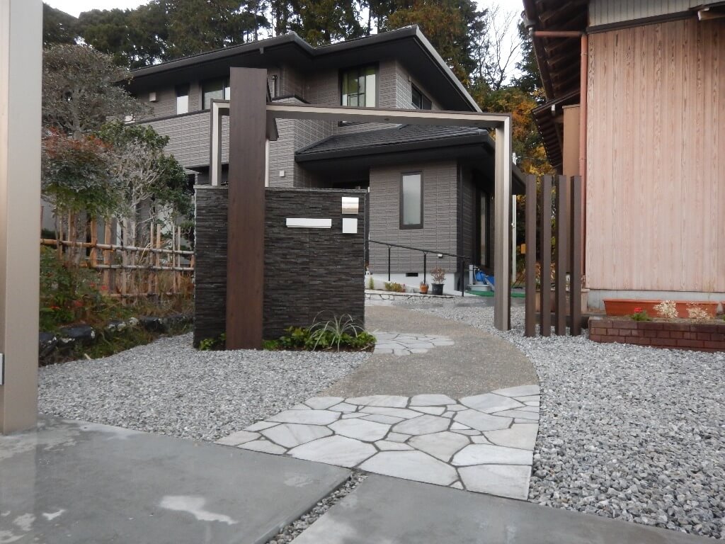 家とリンクさせた ブラックと明るい木目を使ったエクステリア