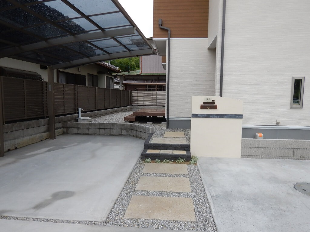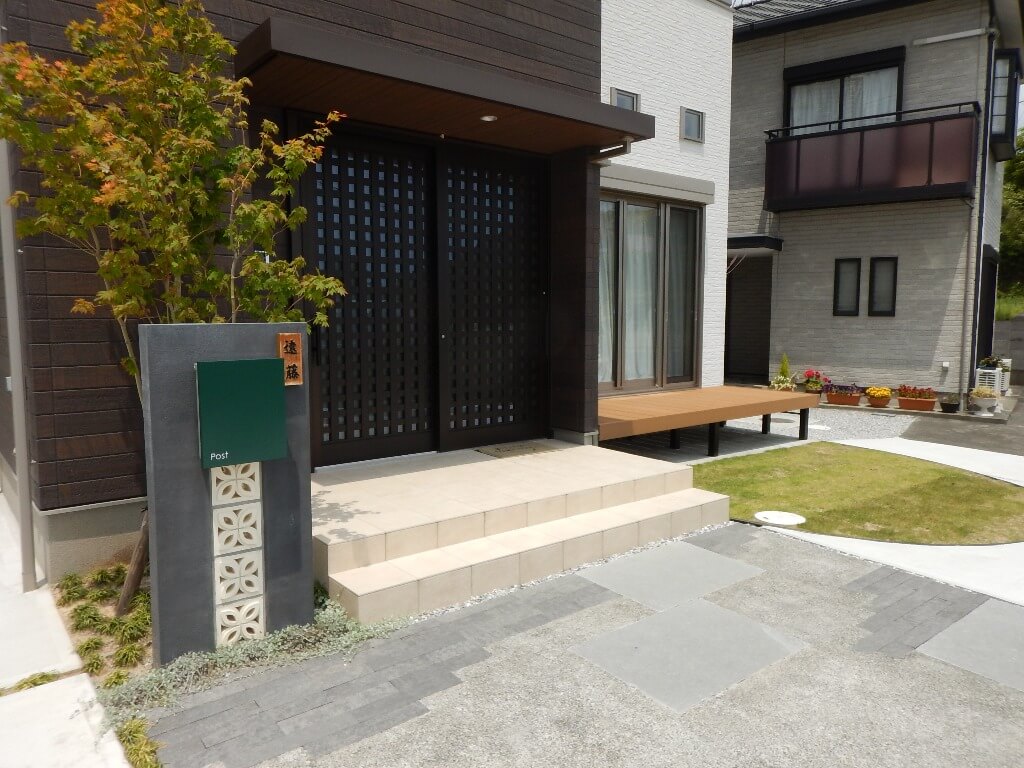 昨今人気の宅配ポストも門柱に組み込み、プライバシーを守る高めの設定の白壁が豪華なエクステリアです